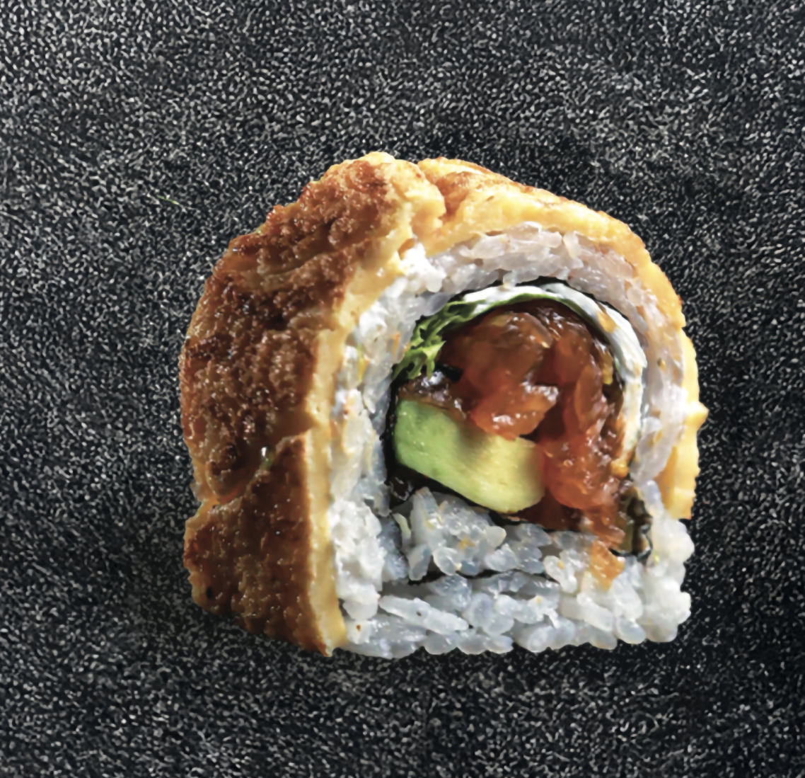 8x fried uramaki with salmon, surimi, cream cheese, vegetable dressing, kabayaki sauce, sesame