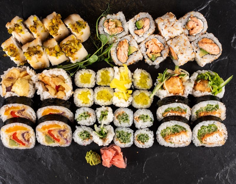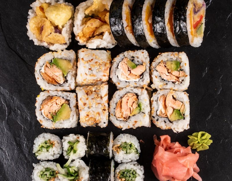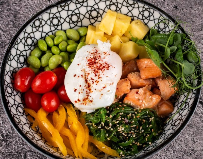łosoś pieczony z warzywami, ryżem i sosem tsuyu