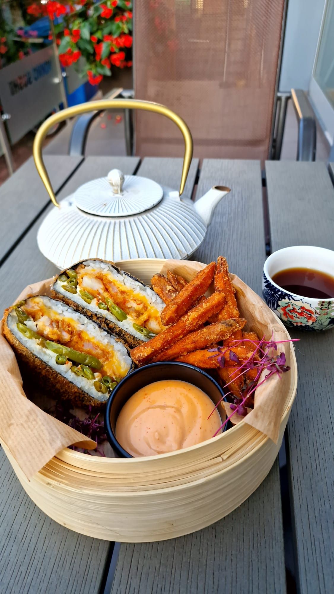 frytki z batatów, sos spicy mayo