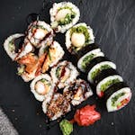 8 x uramaki z pieczoną rybą maślaną obłożone węgorzem (ogórek, sos sezamowy, sos kabayaki, sezam)