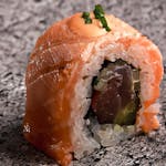 8x uramaki z tuńczykiem obłożone łososiem opalanym