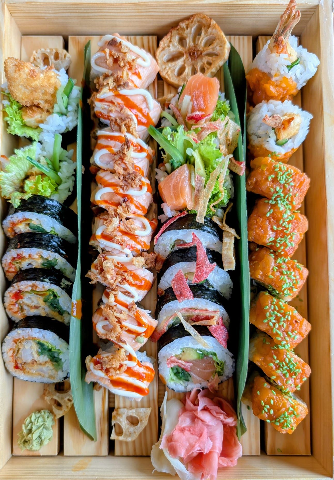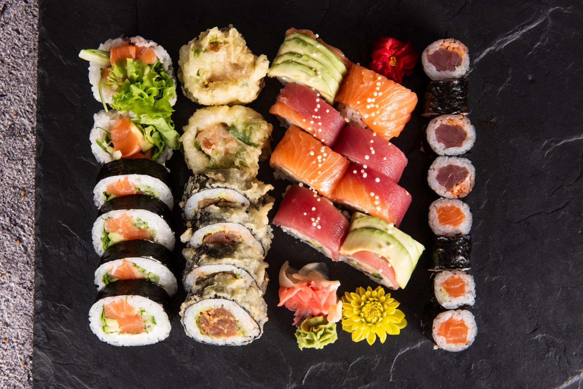6x futomaki w tempurze z tatarem z łososia (ogórek, szczypior, sałata)