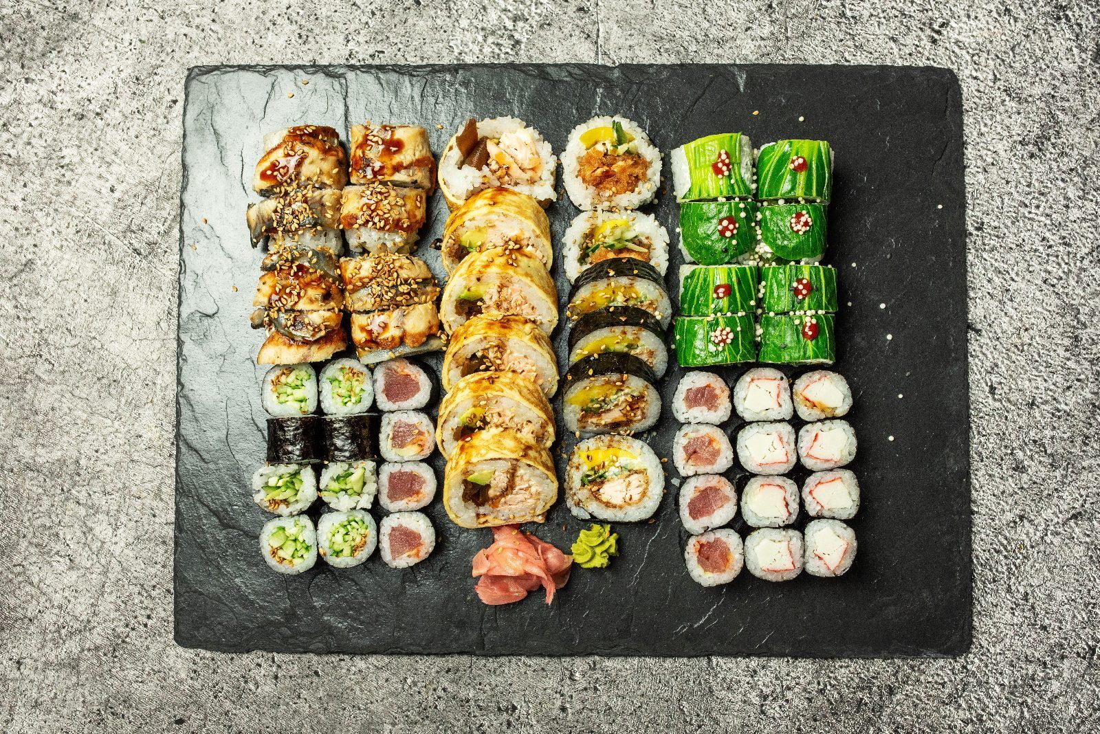 8 x uramaki z pieczoną rybą maślaną obłożone węgorzem 8x uramaki wegańskie obłożone kapustą pak choy 6 x futomaki z łososiem w panko 6 x futomaki z łososiem grillowanym w omlecie 8x hosomaki z tuńczykiem 8x hosomaki z paluszkiem krabowym 8x hosomaki z ogórkiem