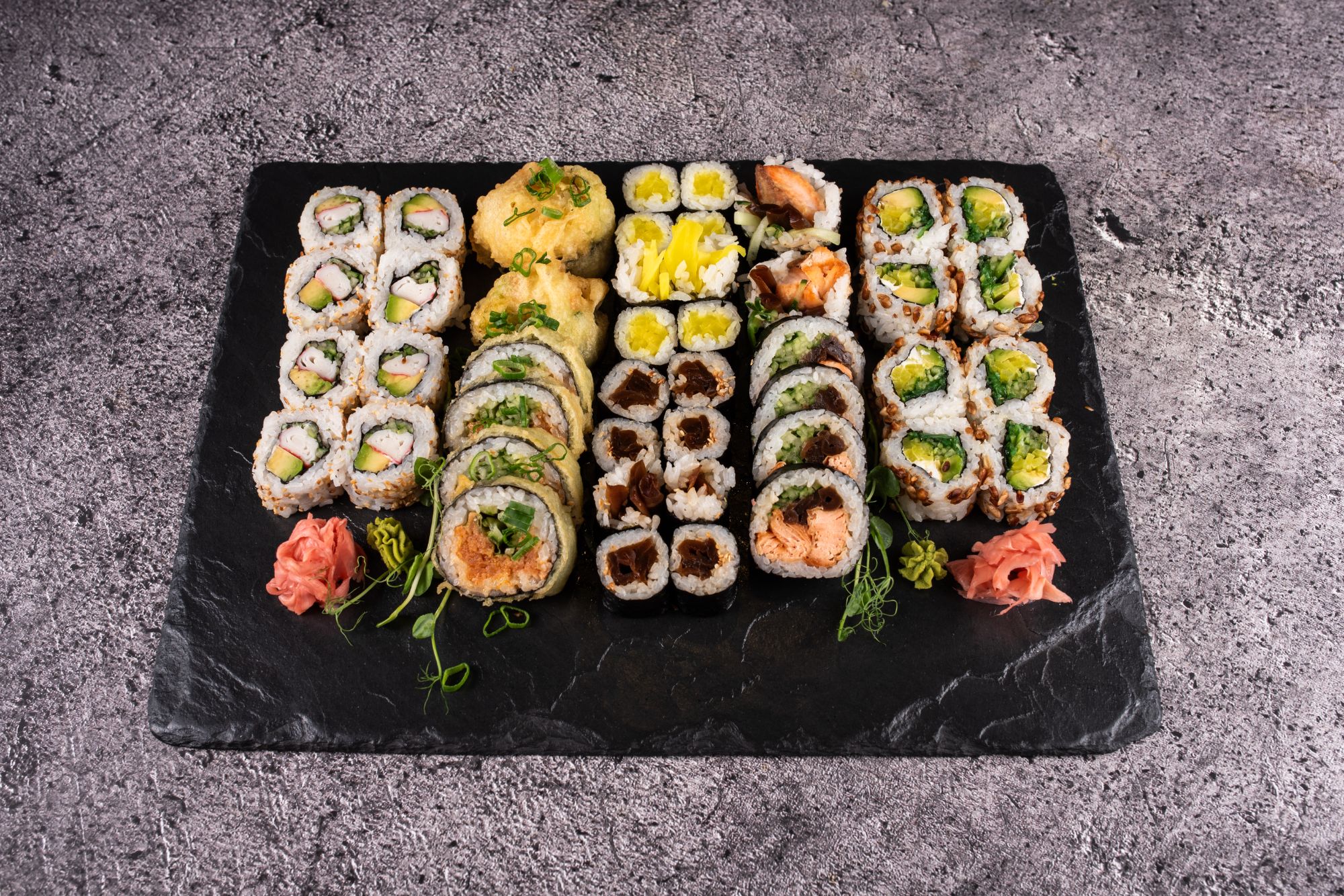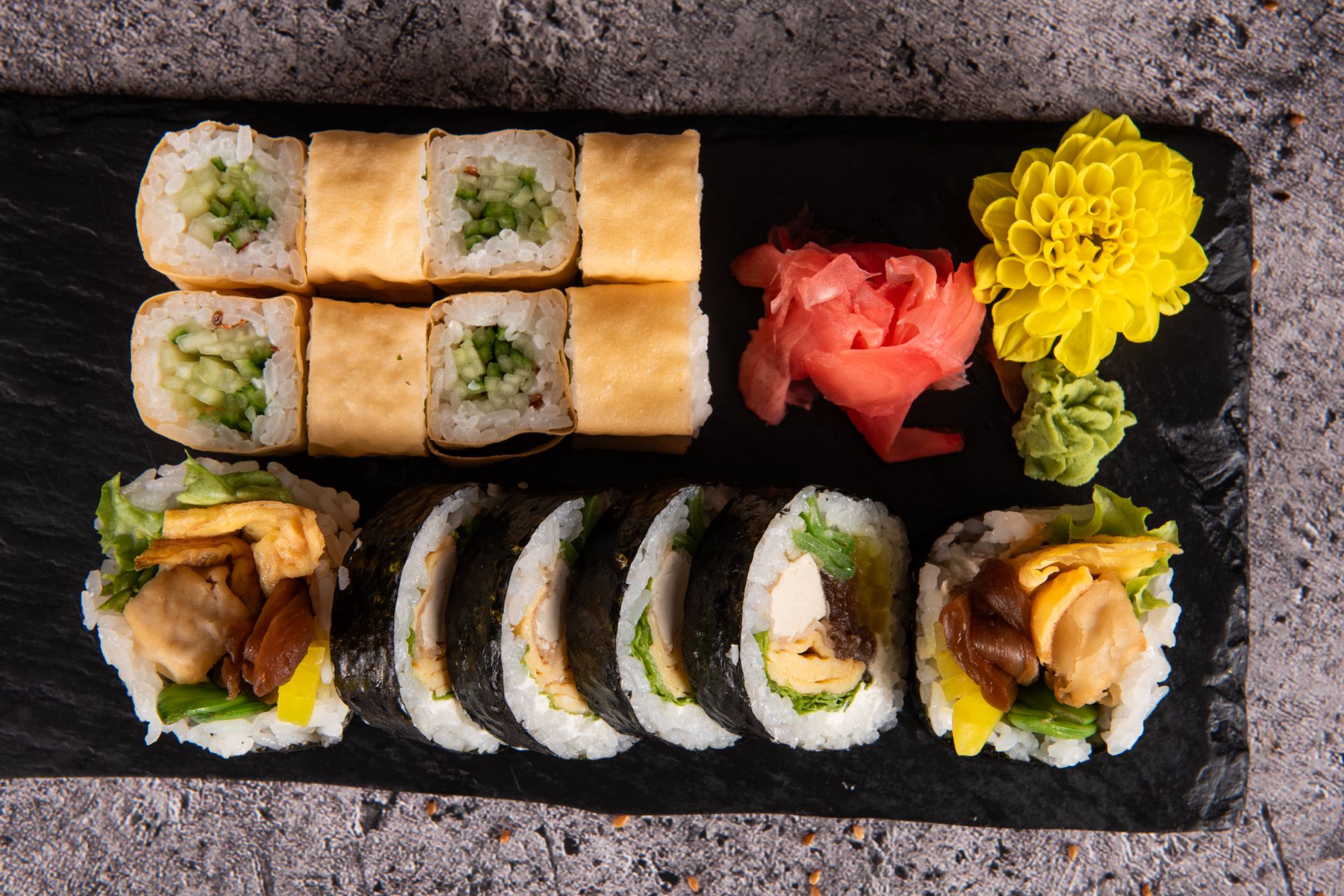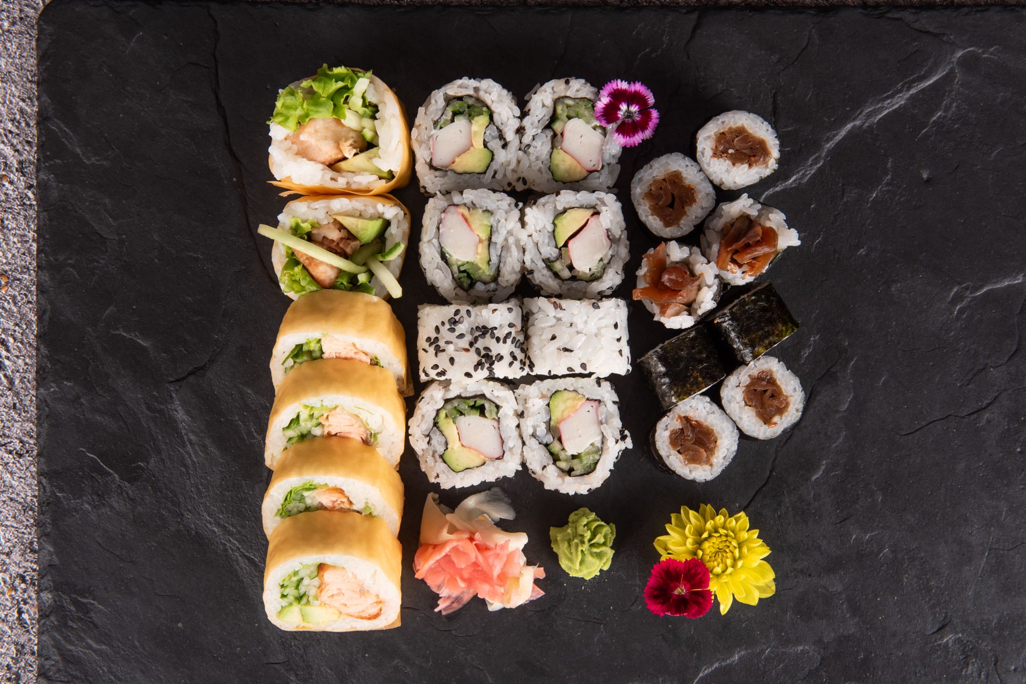 kizami, awokado, rzodkiew marynowana, ogórek, serek